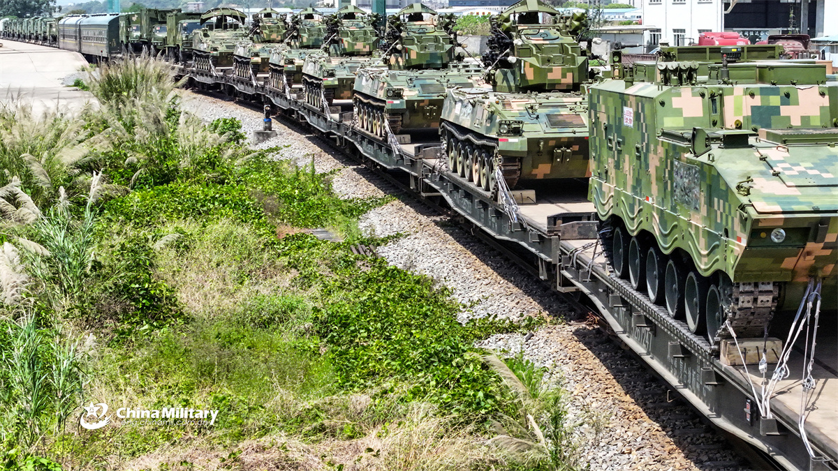Soldiers assigned to an air-defense unit with a brigade under the Chinese PLA 73rd Group Army direct the armored vehicles to drive onto the rail car during a rail-load training exercise, aiming to enhance the troops' long-distance transportation capability on April 23, 2025. (eng.chinamil.com.cn/Photo by Liu Zhiyong)
