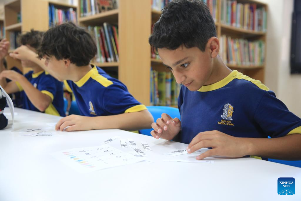 Students learn Chinese characters at the library of St. Clare College Pembroke Secondary School in Pembroke, Malta, on April 29, 2025. A Chinese reading corner was inaugurated Tuesday at the library of St. Clare College Pembroke Secondary School in northeastern Malta, marking the third such facility established by the Chinese Embassy in Malta on local campuses. (Xinhua/Chen Wenxian)