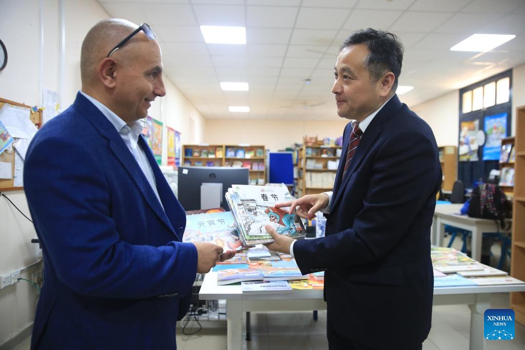 Peng Yijun (R), charge d'affaires of the Chinese Embassy in Malta, donates books to Philip Pace, head of St. Clare College Pembroke Secondary School, at the library of St. Clare College Pembroke Secondary School in Pembroke, Malta, on April 29, 2025. A Chinese reading corner was inaugurated Tuesday at the library of St. Clare College Pembroke Secondary School in northeastern Malta, marking the third such facility established by the Chinese Embassy in Malta on local campuses. (Xinhua/Chen Wenxian)