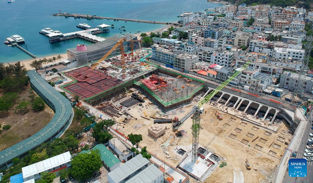 An aerial drone photo taken on April 29, 2025 shows a construction site for the supporting tourism facilities on Wuzhizhou Island, Sanya, south China's Hainan Province. Construction of the supporting tourism facilities on Sanya's Wuzhizhou Island, a national-level tourist attraction, is progressing at an accelerated pace. Upon completion, the project is expected to boost tourism accommodation capacity while serving environmental protection purposes. (Xinhua/Zhao Yingquan)
