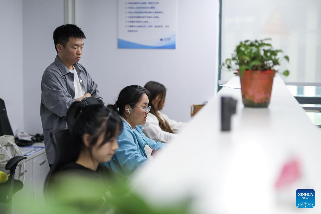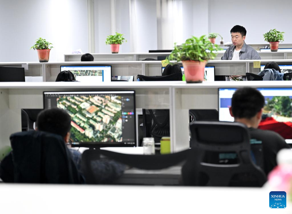 Employees work at a company providing data solutions for satellite internet in Hebi, central China's Henan Province, April 21, 2025. (Xinhua/Du Xiaoyi)