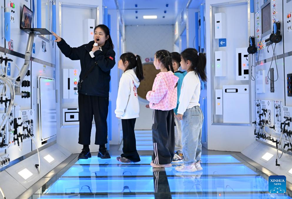 Kids visit a space station model at an aerospace science popularization base in a satellite manufacturing industrial park in Hebi, central China's Henan Province, April 21, 2025. (Xinhua/Li Jianan)