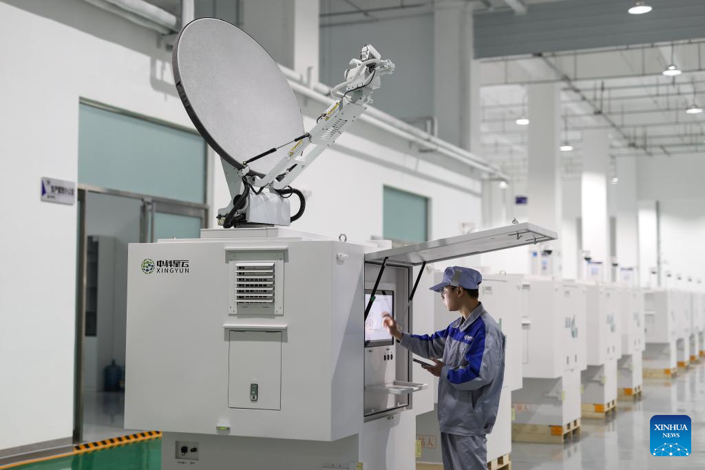An employee checks the assembly of a satellite at a satellite manufacturing base in Hebi, central China's Henan Province, April 21, 2025. (Xinhua/Li Jianan)