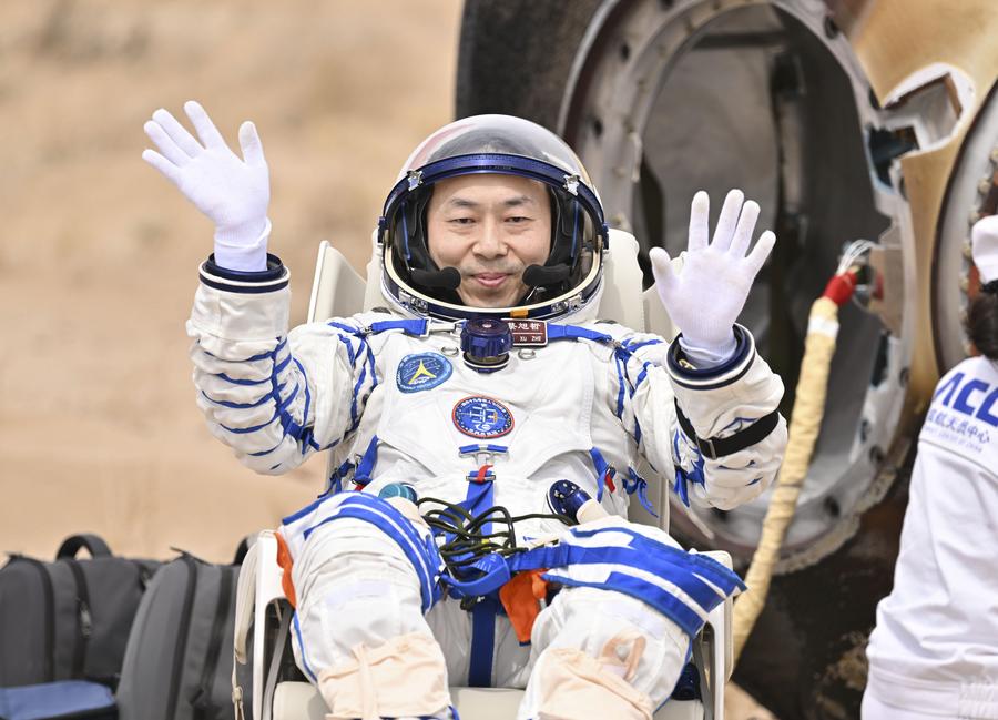 Astronaut Cai Xuzhe is out of the return capsule of the Shenzhou-19 crewed spaceship at the Dongfeng landing site in north China's Inner Mongolia Autonomous Region, April 30, 2025. (Xinhua/Li Xin)
