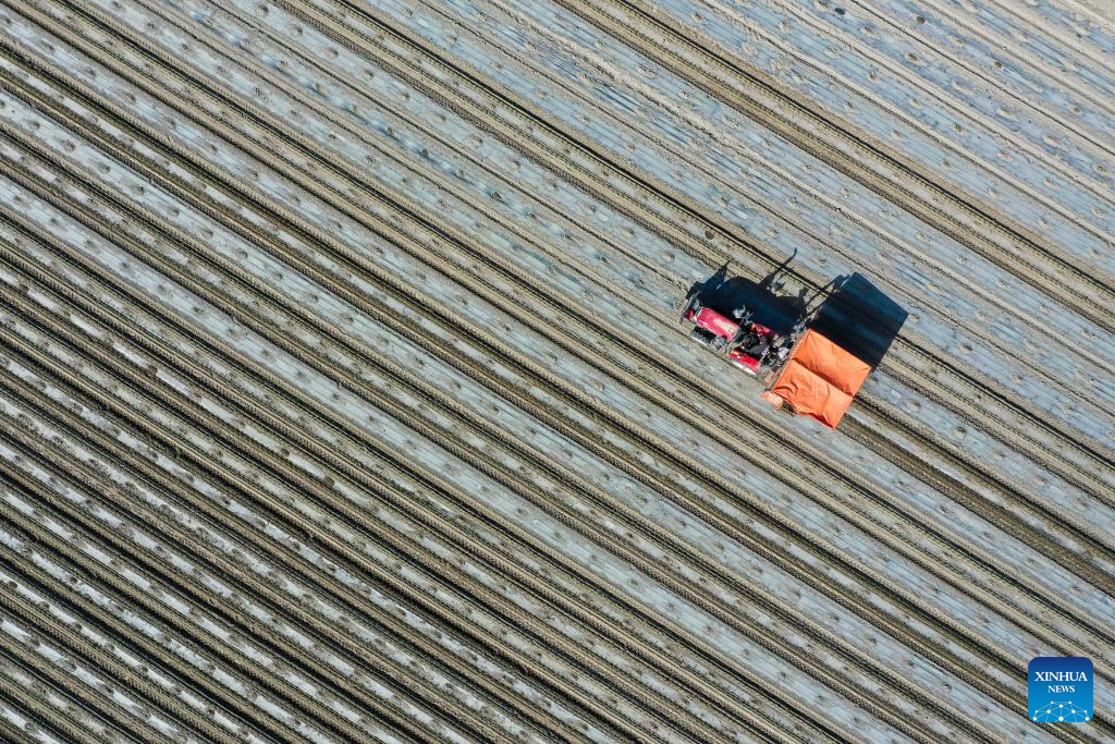 An aerial drone photo taken on April 28, 2025 shows a transplanting machine working in a red pepper field in Bumbut Town, Mongolian Autonomous Prefecture of Bayingolin in northwest China's Xinjiang Uygur Autonomous Region. The application of mechanized, intelligent and automated equipment improves the efficiency of local tomato and red pepper planting. (Xinhua/Ding Lei)