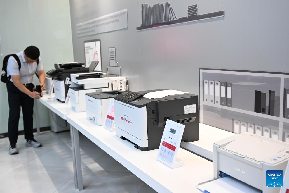 A visitor takes photos of printer products at Ninestar Corporation in Zhuhai, south China's Guangdong Province, April 29, 2025.