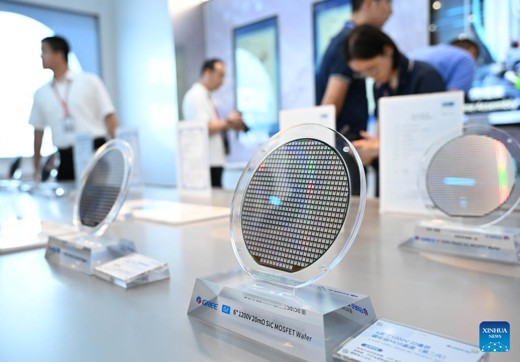 Six-inch silicon carbide wafers are pictured at a company of Gree Electric Appliances Inc. of Zhuhai in south China's Guangdong Province, April 29, 2025.