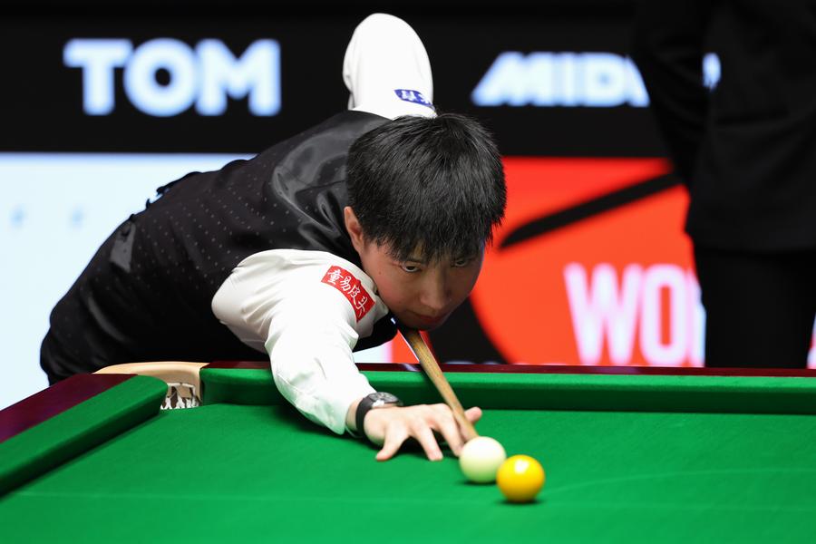 China's Zhao Xintong plays a shot during his quarterfinal against Chris Wakelin of England at the 2025 World Snooker Championship in Sheffield, Britain, on April 30, 2025. (Photo by Zhai Zheng/Xinhua)