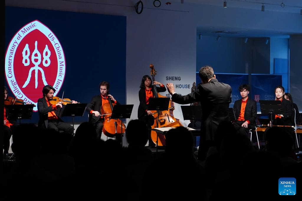 Members of the Bard East-West Ensemble perform during the annual international conference of the U.S.-China Music Institute at the China Institute in New York, the United States, May 1, 2025. (Photo by Ada Zhang/Xinhua)
