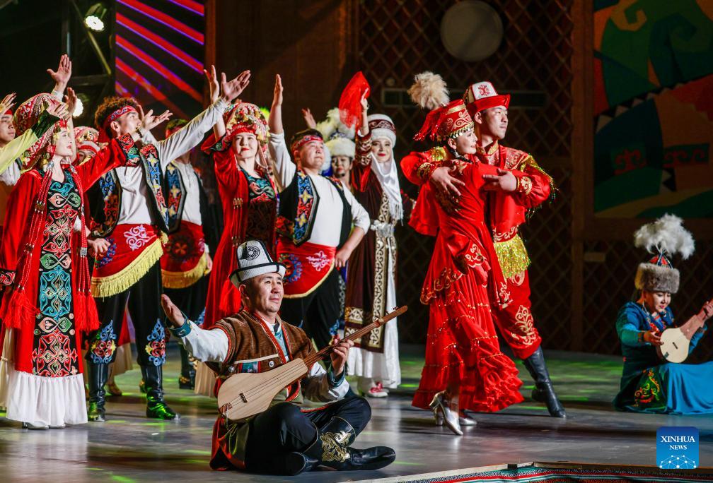 Artists perform the "Manas" epic at a local theater in Artux City, Kizilsu Kirgiz Autonomous Prefecture in northwest China's Xinjiang Uygur Autonomous Region, April 22, 2025. (Xinhua/Xu Hongyan)