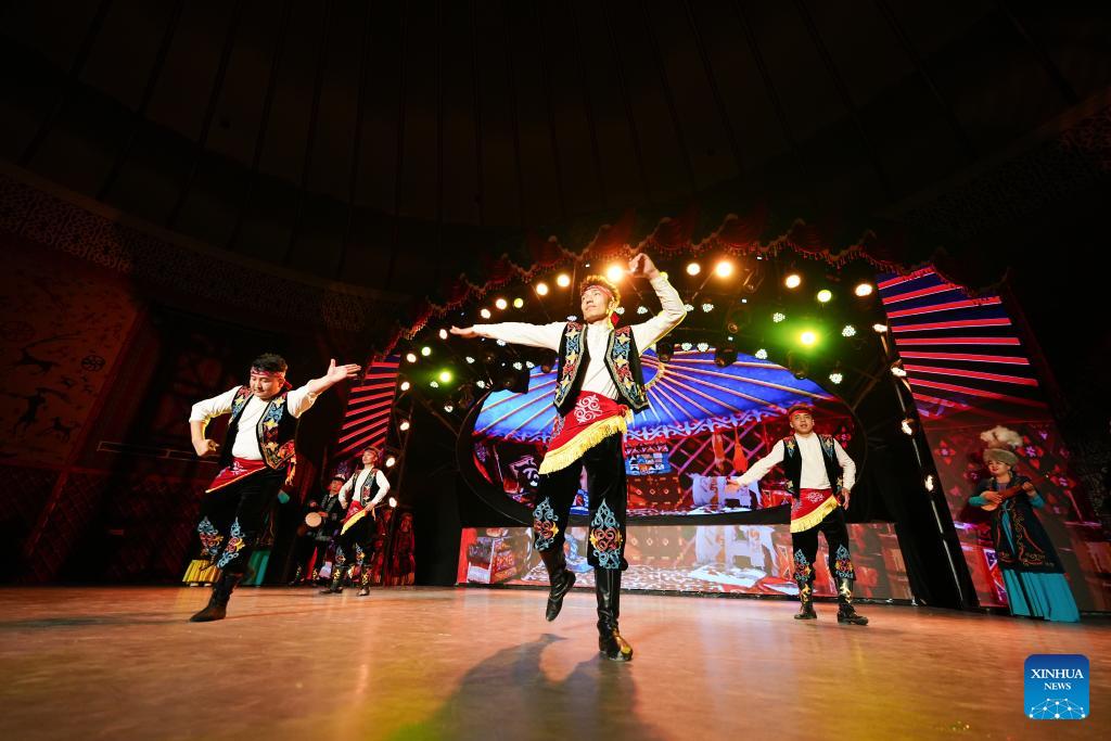 Artists and visitors dance to music at a local theater in Artux City, Kizilsu Kirgiz Autonomous Prefecture in northwest China's Xinjiang Uygur Autonomous Region, April 22, 2025. (Xinhua/Wang Fei)