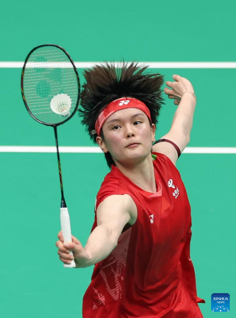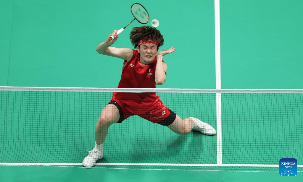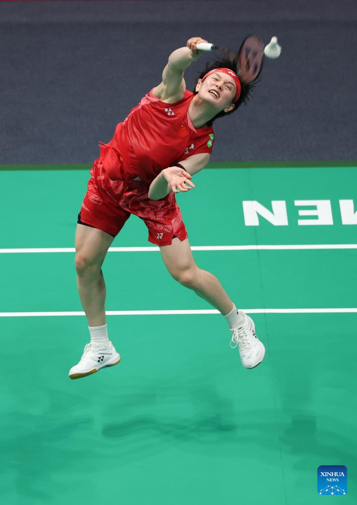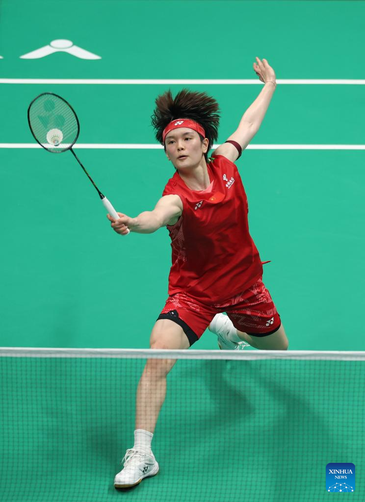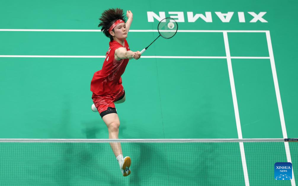 Wang Zhiyi of China competes in the women's singles match against An Se Young of South Korea during the final match between China and South Korea at BWF Sudirman Cup in Xiamen, southeast China's Fujian Province, May 4, 2025. (Xinhua/Sun Fei)