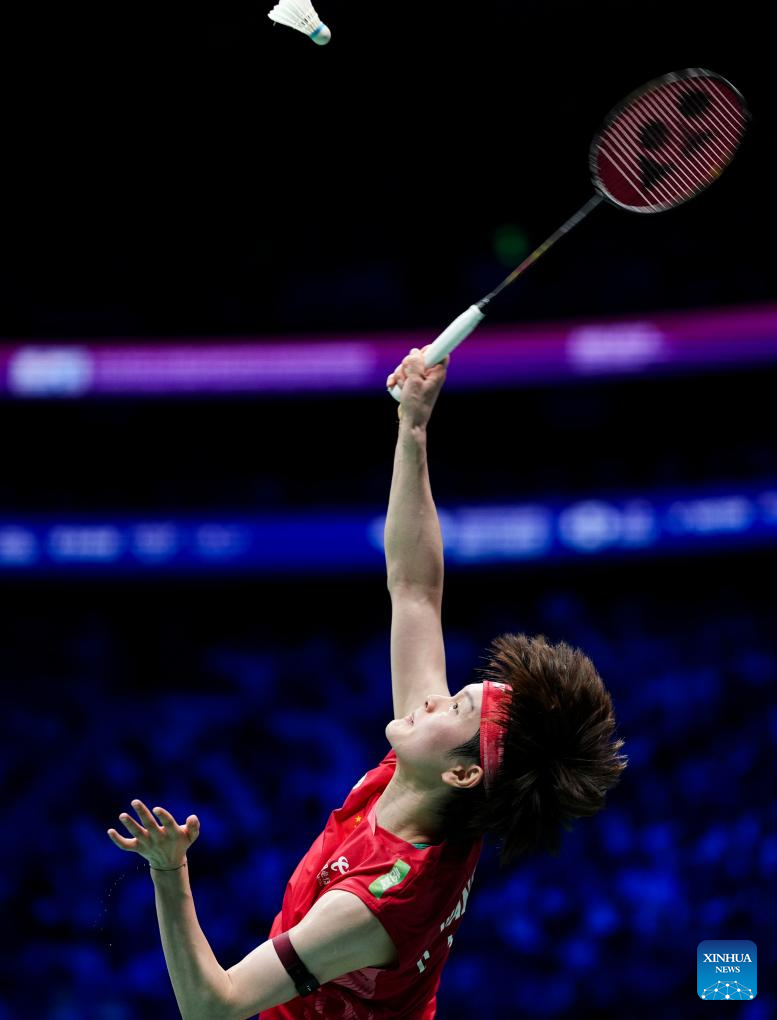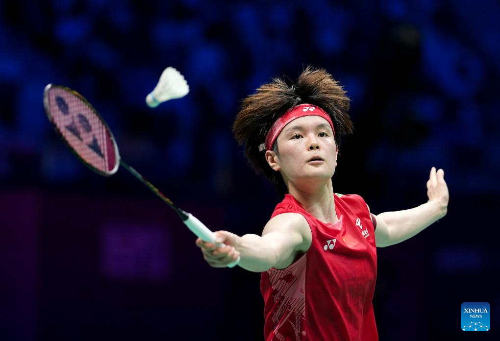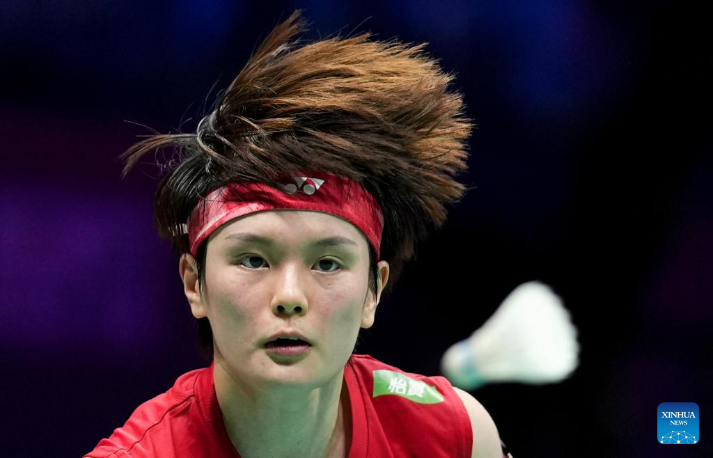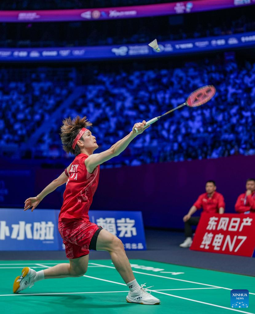 Wang Zhiyi of China competes in the women's singles match against An Se Young of South Korea during the final match between China and South Korea at BWF Sudirman Cup in Xiamen, southeast China's Fujian Province, May 4, 2025. (Xinhua/Sun Fei)
