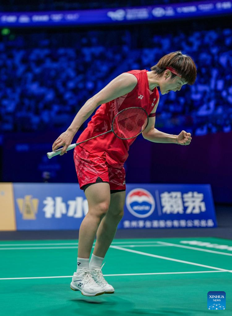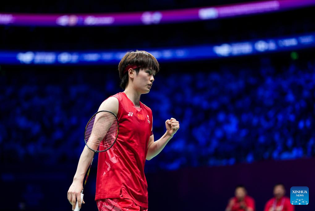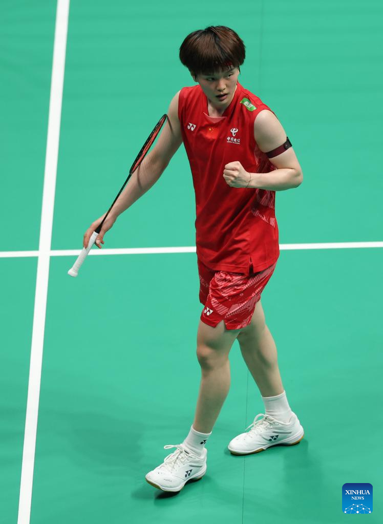 Wang Zhiyi of China reacts in the women's singles match against An Se Young of South Korea during the final match between China and South Korea at BWF Sudirman Cup in Xiamen, southeast China's Fujian Province, May 4, 2025. (Xinhua/Sun Fei)