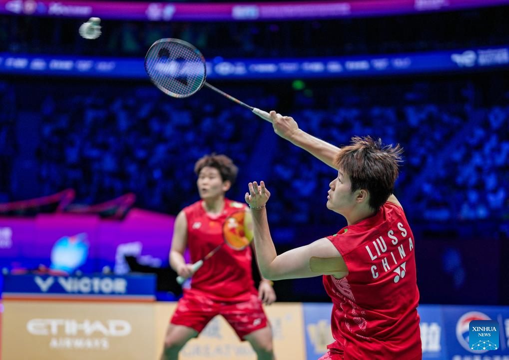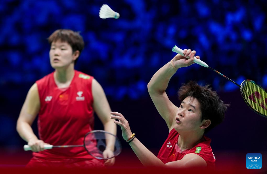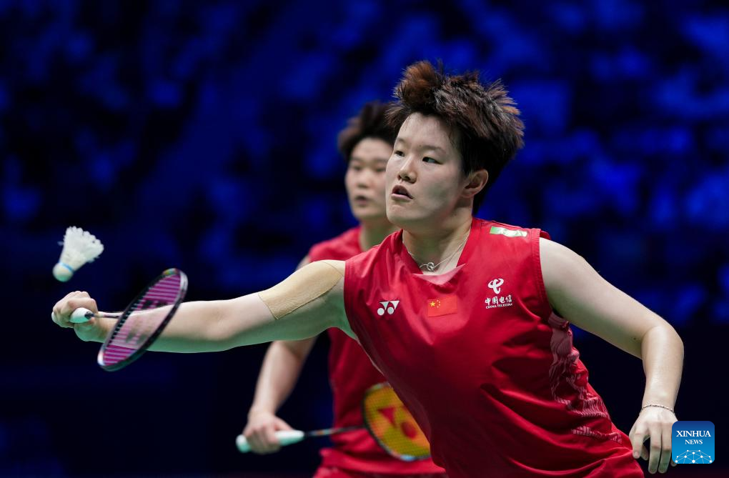 Liu Shengshu (R)/Tan Ning of China compete in the women's doubles match against Baek Ha Na/Lee So Hee of South Korea during the final match between China and South Korea at BWF Sudirman Cup in Xiamen, southeast China's Fujian Province, May 4, 2025. (Xinhua/Sun Fei)
