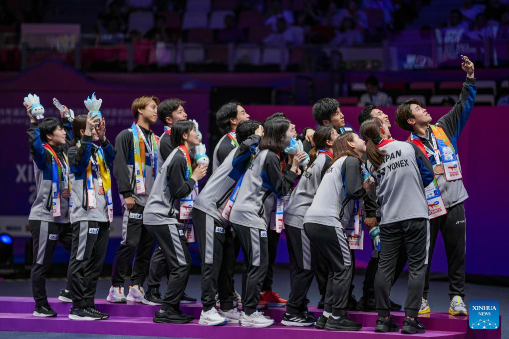 Third place team Japan take selfie on the podium during the awarding ceremony at BWF Sudirman Cup in Xiamen, southeast China's Fujian Province, May 4, 2025. (Xinhua/Sun Fei)