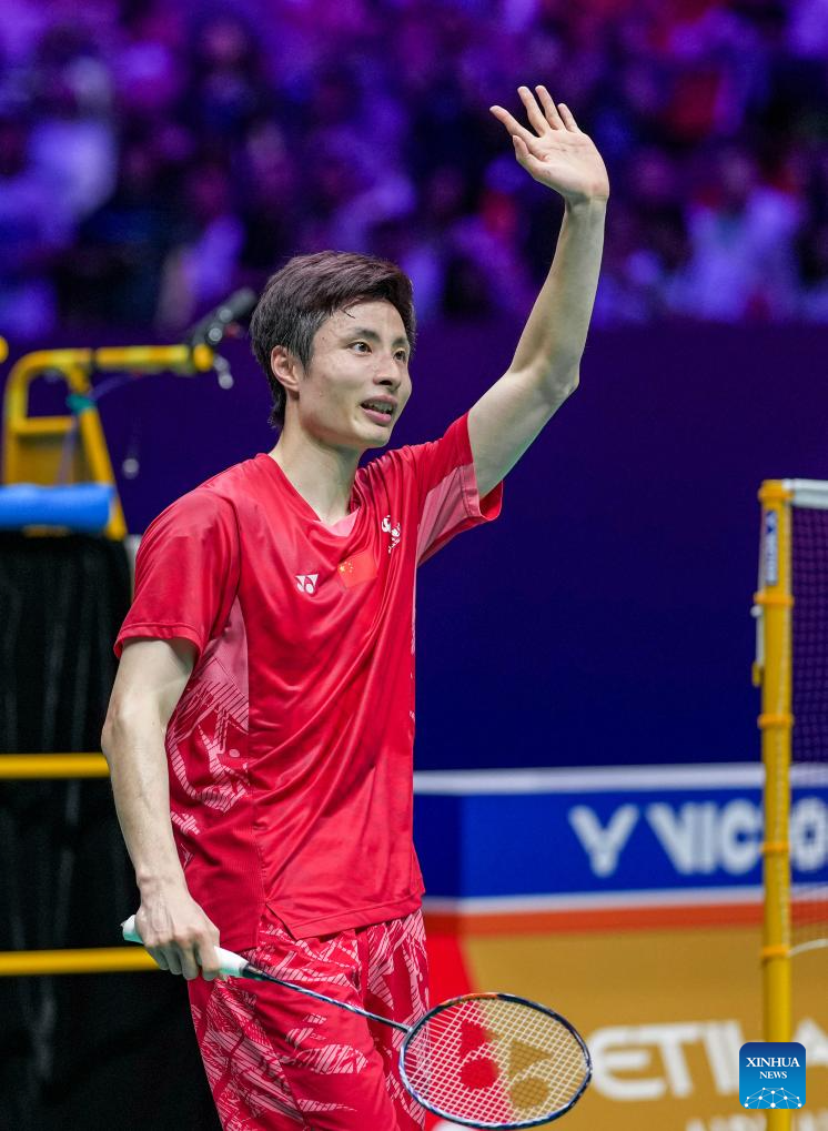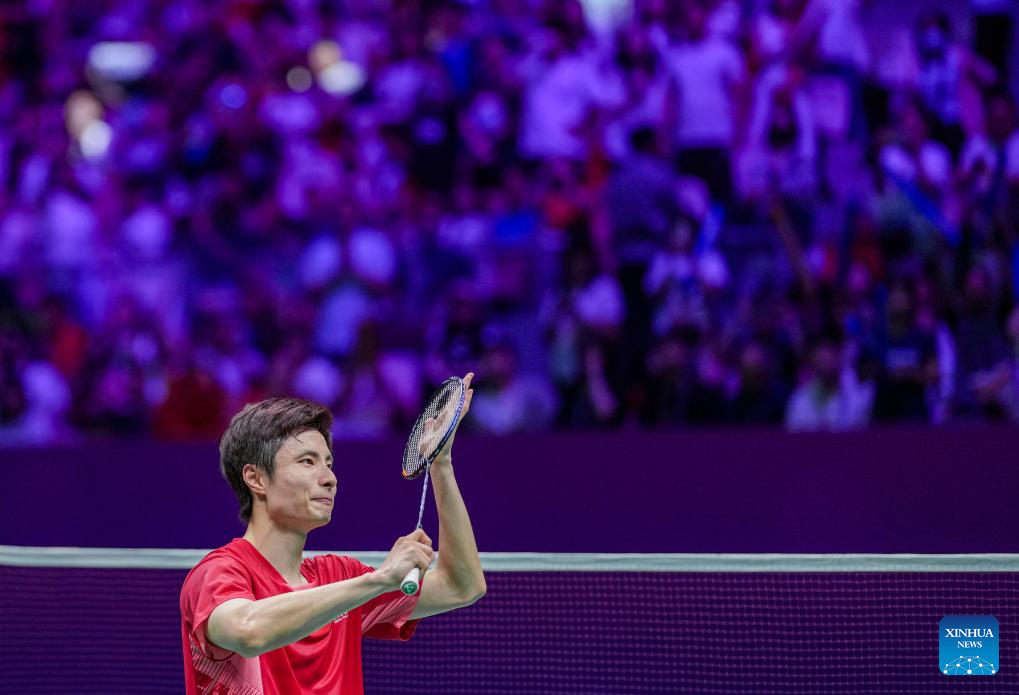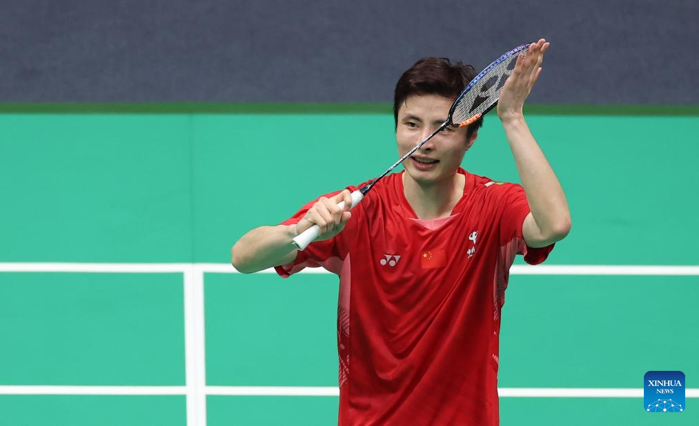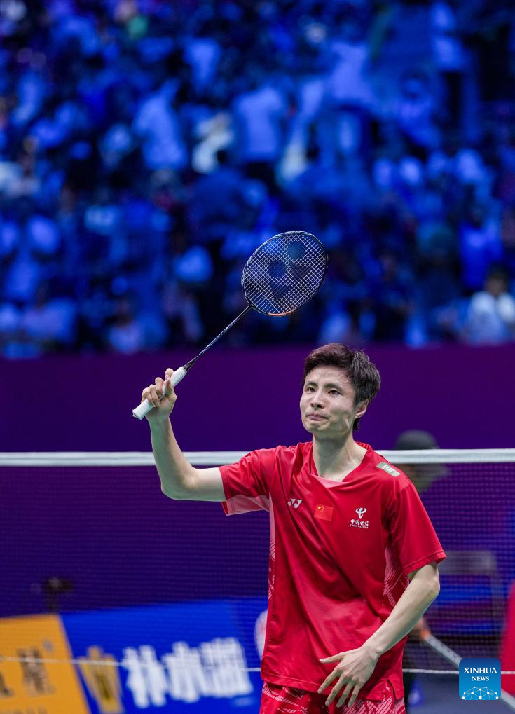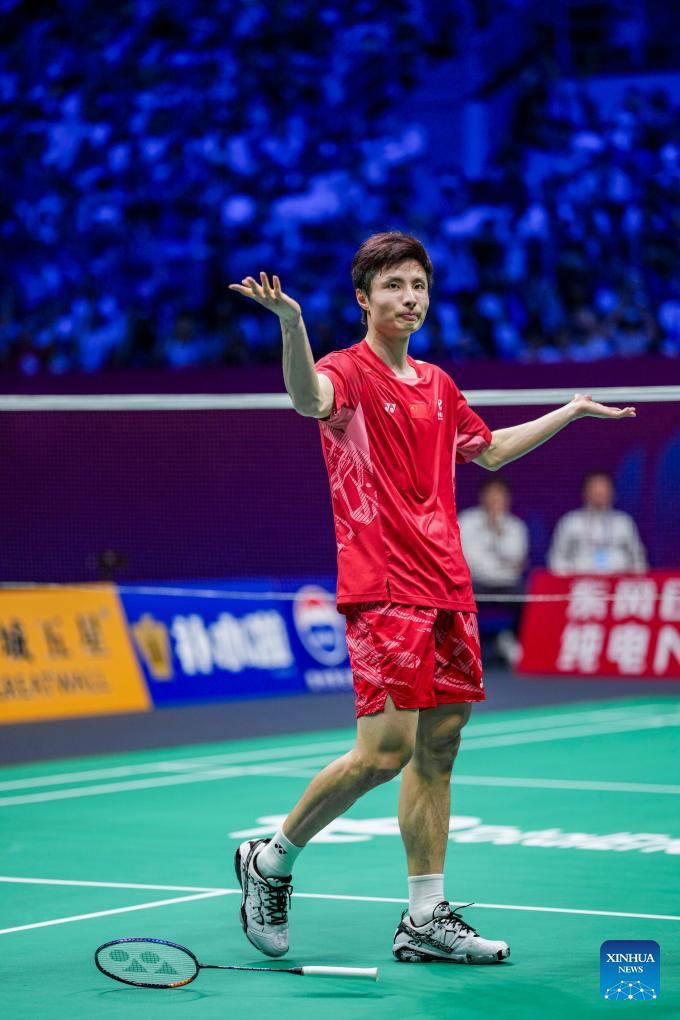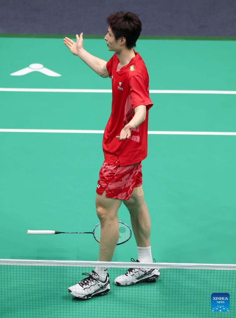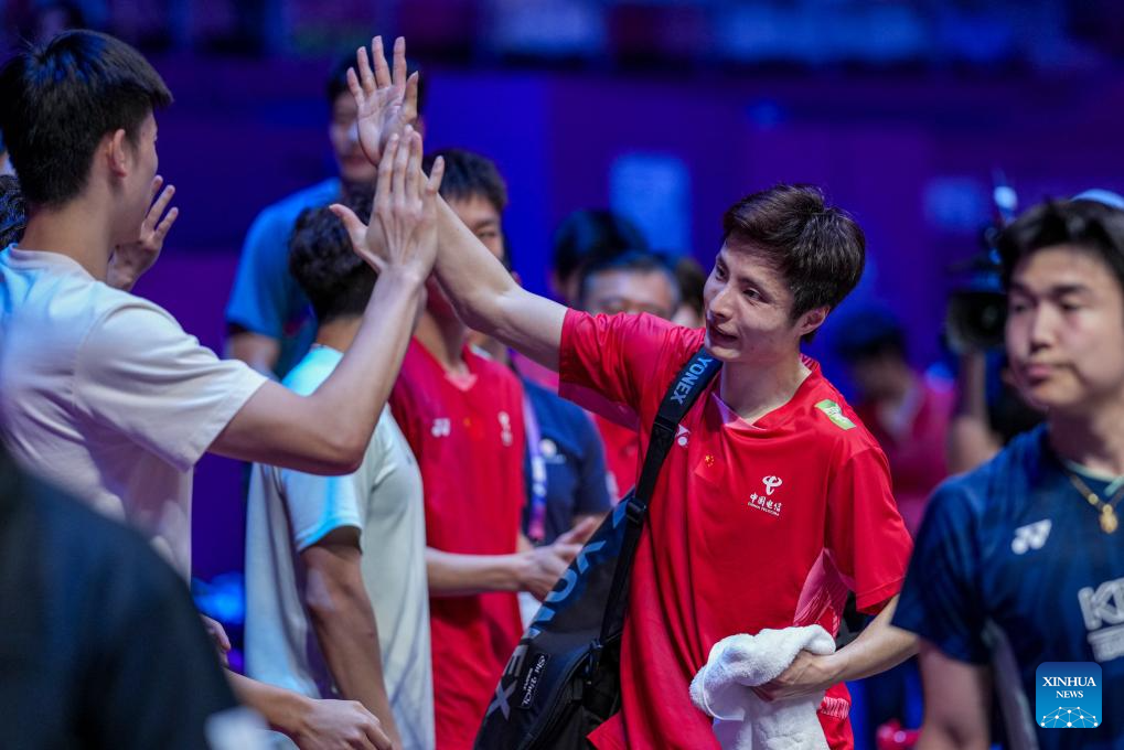 Shi Yuqi (C) of China celebrates after winning the men's singles match against Jeon Hyeok Jin of South Korea during the final match between China and South Korea at BWF Sudirman Cup in Xiamen, southeast China's Fujian Province, May 4, 2025. (Xinhua/Sun Fei)