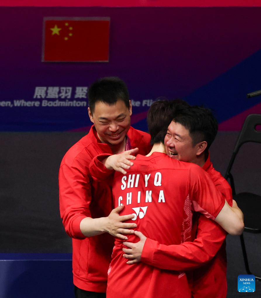 Shi Yuqi (C) of China celebrates with coach after winning the men's singles match against Jeon Hyeok Jin of South Korea during the final match between China and South Korea at BWF Sudirman Cup in Xiamen, southeast China's Fujian Province, May 4, 2025. (Xinhua/Wang Kaiyan)