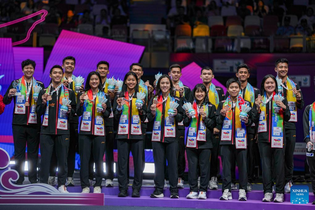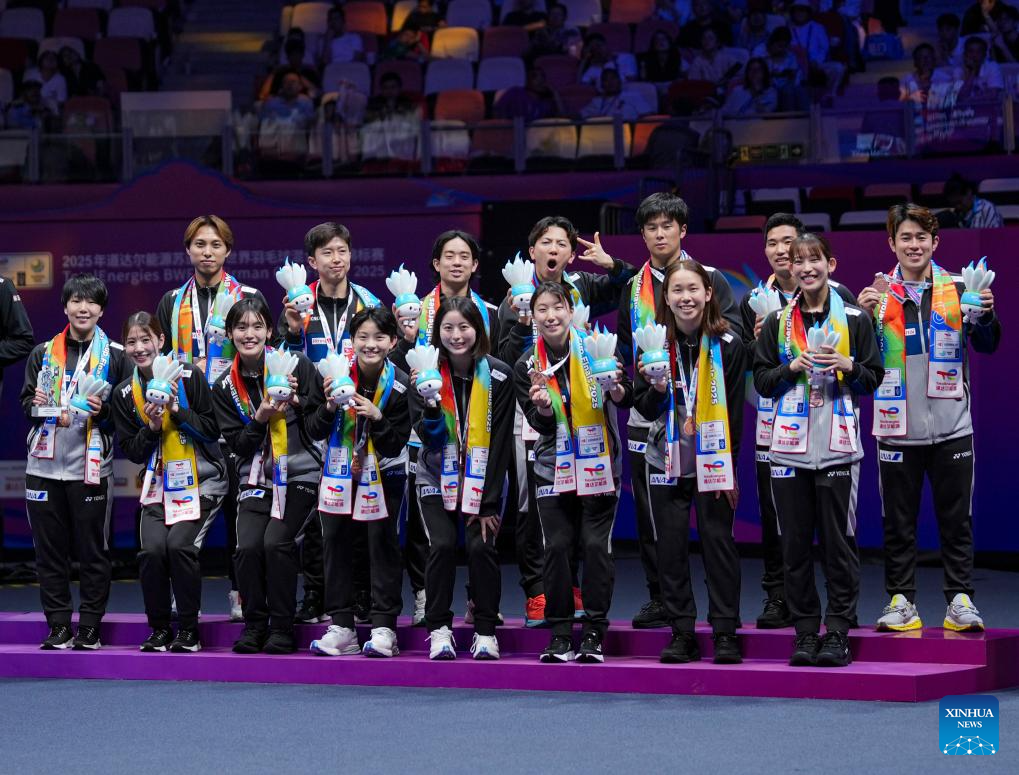 Third place team Indonesia pose on the podium during the awarding ceremony at BWF Sudirman Cup in Xiamen, southeast China's Fujian Province, May 4, 2025. (Xinhua/Sun Fei)