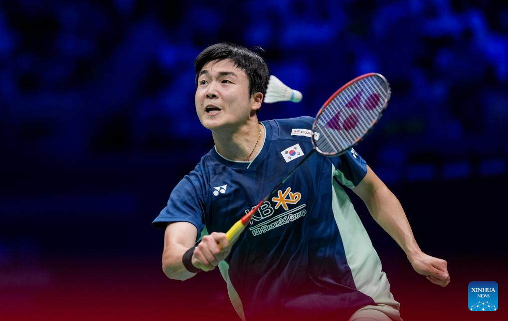 Jeon Hyeok Jin of South Korea competes in the men's singles match against Shi Yuqi of China during the final match between China and South Korea at BWF Sudirman Cup in Xiamen, southeast China's Fujian Province, May 4, 2025. (Xinhua/Sun Fei)