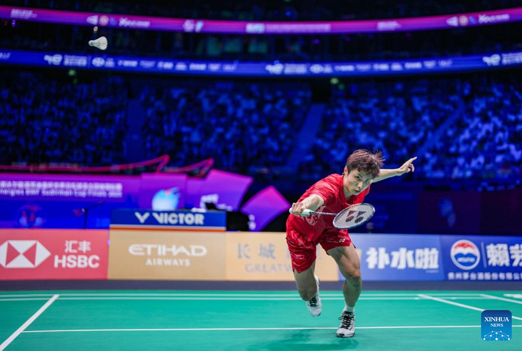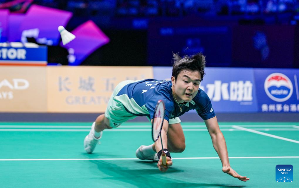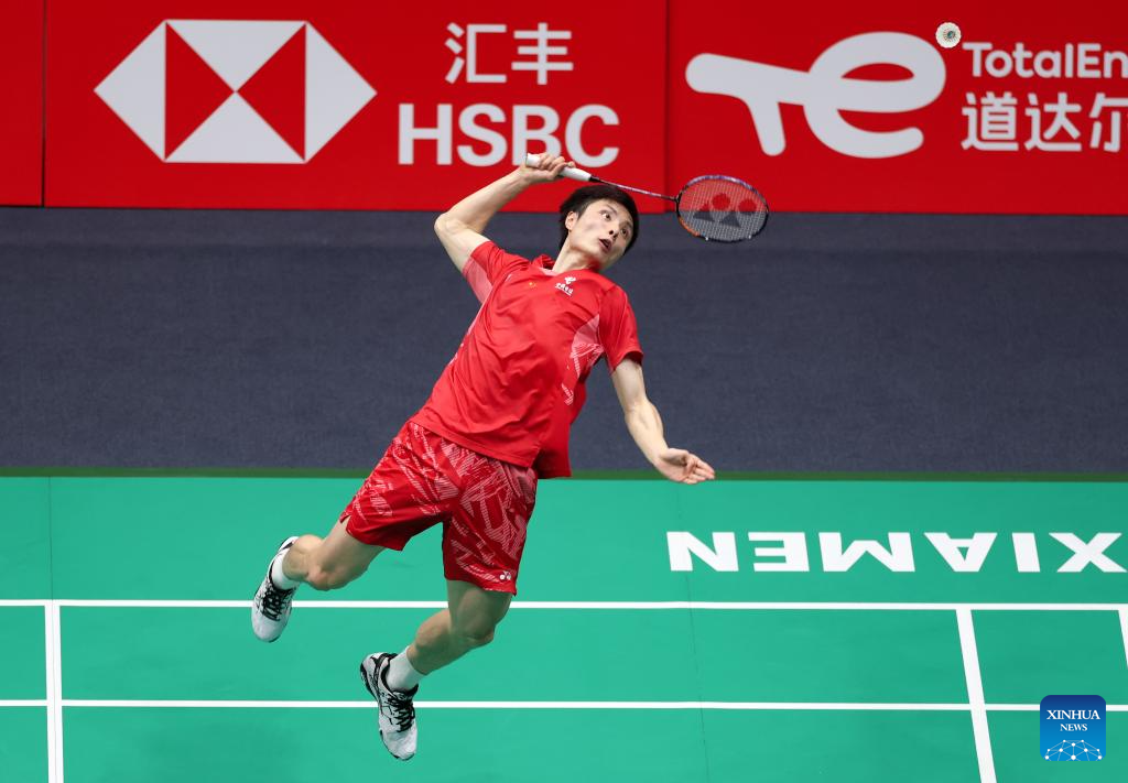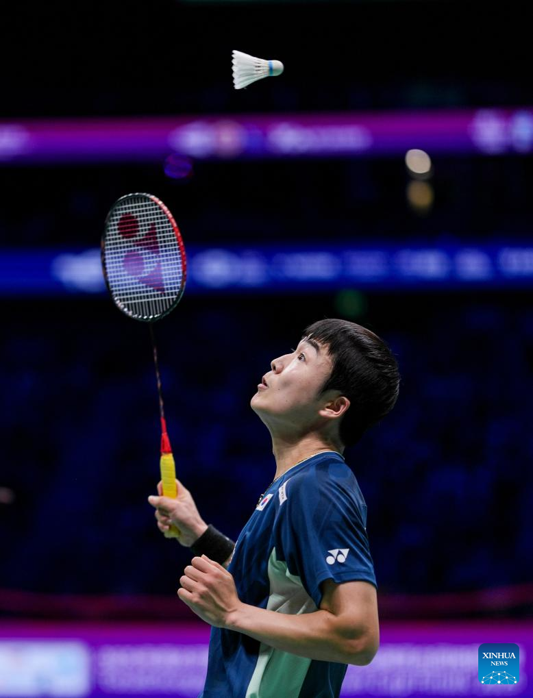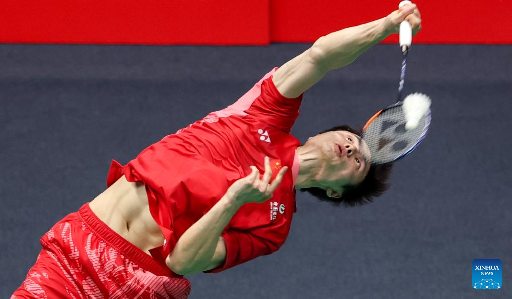 Shi Yuqi of China competes in the men's singles match against Jeon Hyeok Jin of South Korea during the final match between China and South Korea at BWF Sudirman Cup in Xiamen, southeast China's Fujian Province, May 4, 2025. (Xinhua/Wang Kaiyan)