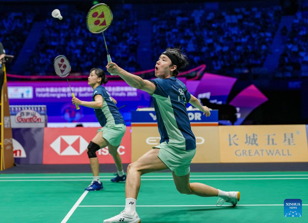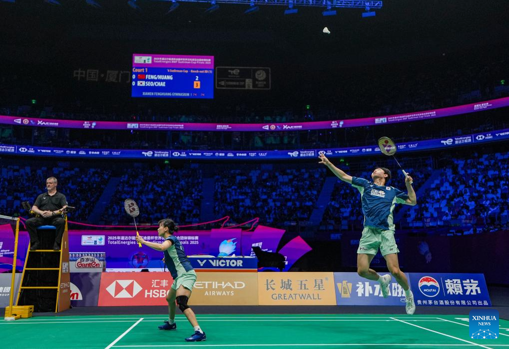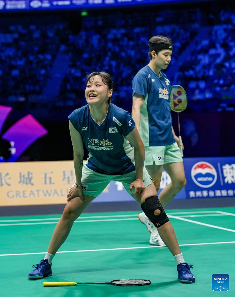 Seo Seung Jae (R)/Chae Yu Jung of South Korea compete in the mixed doubles match against Feng Yanzhe/Huang Dongping of China during the final match between China and South Korea at BWF Sudirman Cup in Xiamen, southeast China's Fujian Province, May 4, 2025. (Xinhua/Sun Fei)
