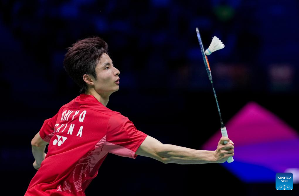 Shi Yuqi of China competes in the men's singles match against Jeon Hyeok Jin of South Korea during the final match between China and South Korea at BWF Sudirman Cup in Xiamen, southeast China's Fujian Province, May 4, 2025. (Xinhua/Sun Fei)