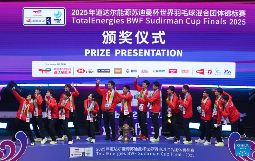 First place winner team China celebrate with the trophy on the podium during the awarding ceremony at BWF Sudirman Cup in Xiamen, southeast China's Fujian Province, May 4, 2025. (Xinhua/Sun Fei)