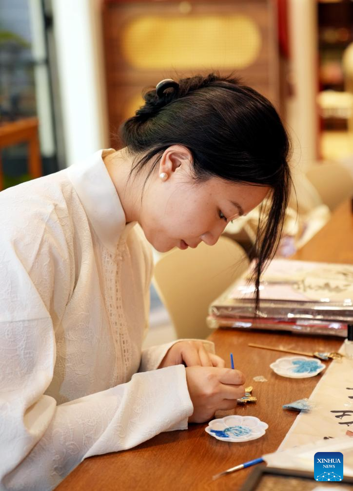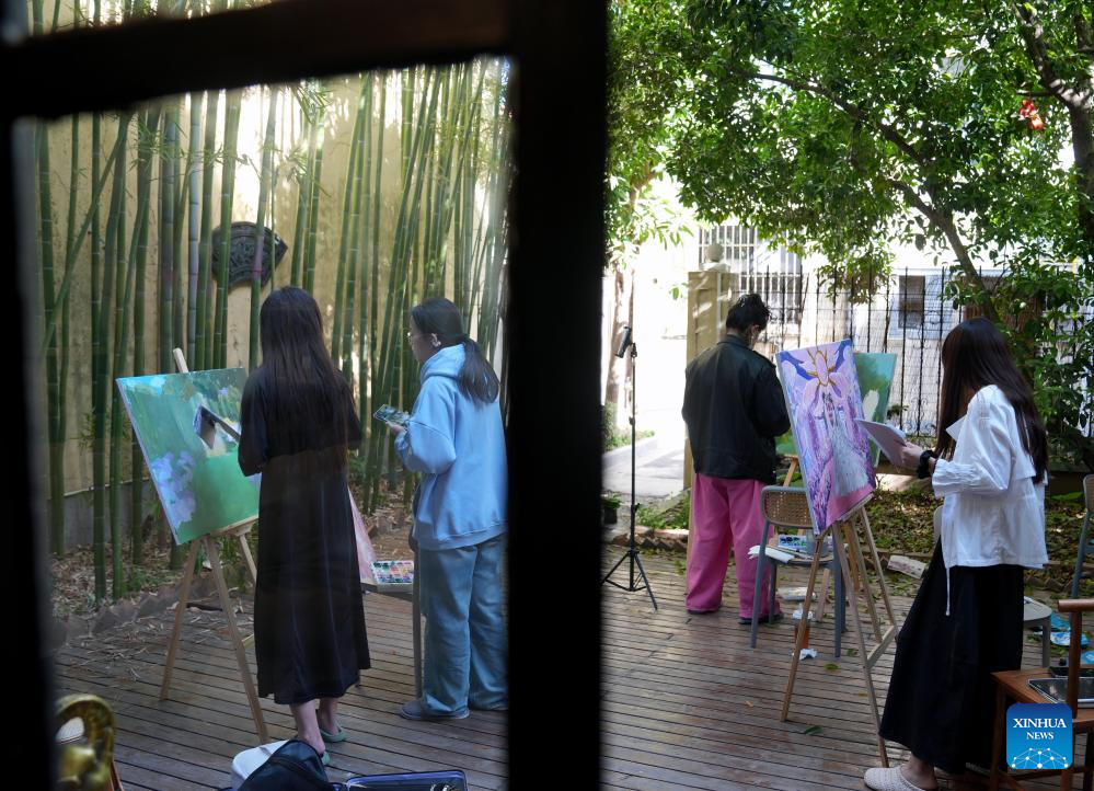 People attend a painting workshop themed on wedding at "Jinkun Xinshe", a traditional Chinese-style handicraft studio, in Xuhui District of Shanghai, east China, April 26, 2025. "Jinkun Xinshe" was founded by Si Fangfang and Li Wen, who have converted a foreign-style house into a tranquil and elegant space to offer traditional handicraft courses such as bracelet making, rope braiding, incense crafting, and gold foil painting.(Xinhua/Liu Ying)