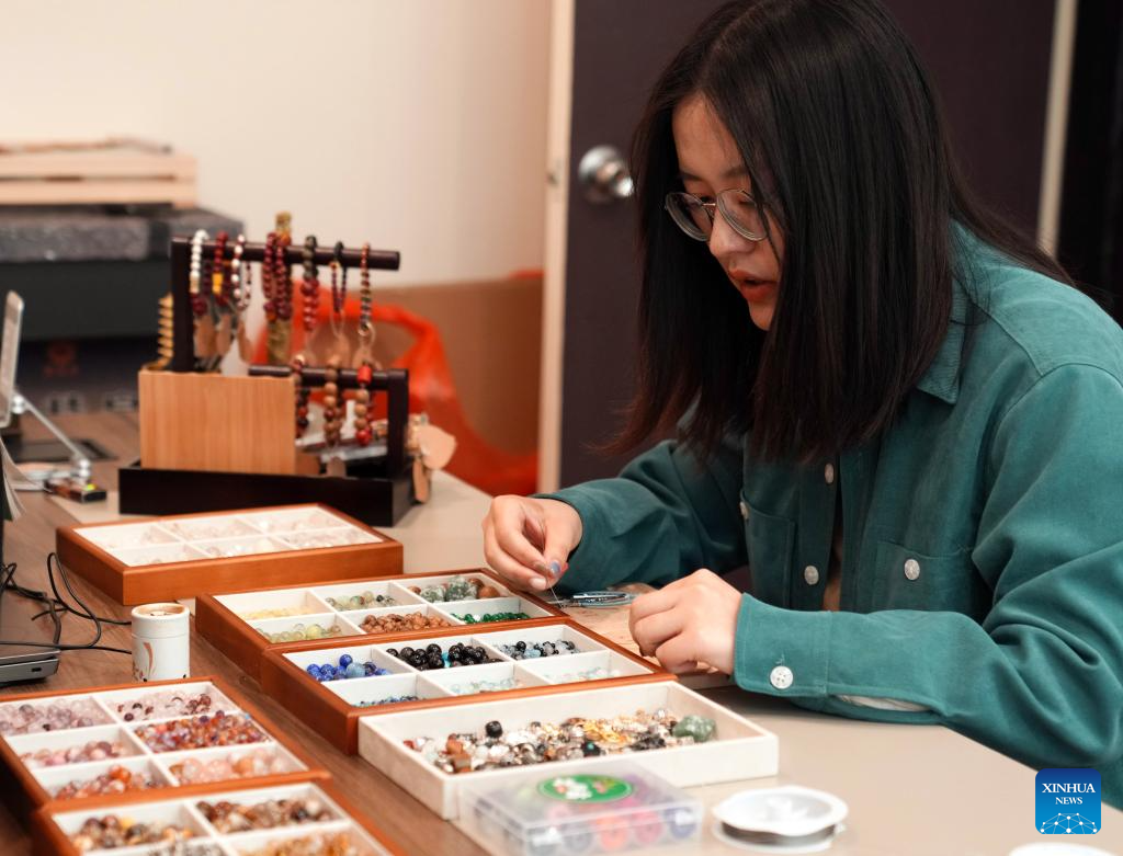 Li Wen introduces the bracelets made by customers and herself at "Jinkun Xinshe", a traditional Chinese-style handicraft studio, in Xuhui District of Shanghai, east China, April 18, 2025. "Jinkun Xinshe" was founded by Si Fangfang and Li Wen, who have converted a foreign-style house into a tranquil and elegant space to offer traditional handicraft courses such as bracelet making, rope braiding, incense crafting, and gold foil painting.(Xinhua/Liu Ying)