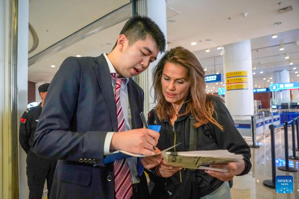 A staff member provides the departure tax refund service for a tourist from Russia at a shopping plaza in Beijing, capital of China, April 30, 2025. (Xinhua/Ju Huanzong)