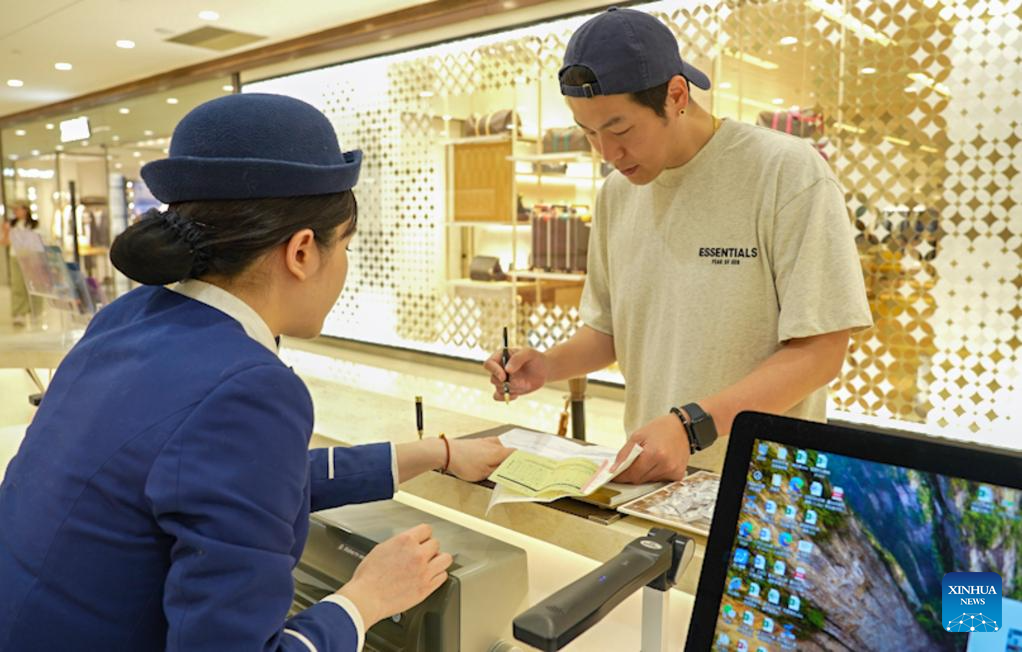 A staff member (L) provides the departure tax refund service for a tourist from South Korea at a shopping plaza in southwest China's Chongqing Municipality, April 11, 2025. (Photo by Guorui/Xinhua)