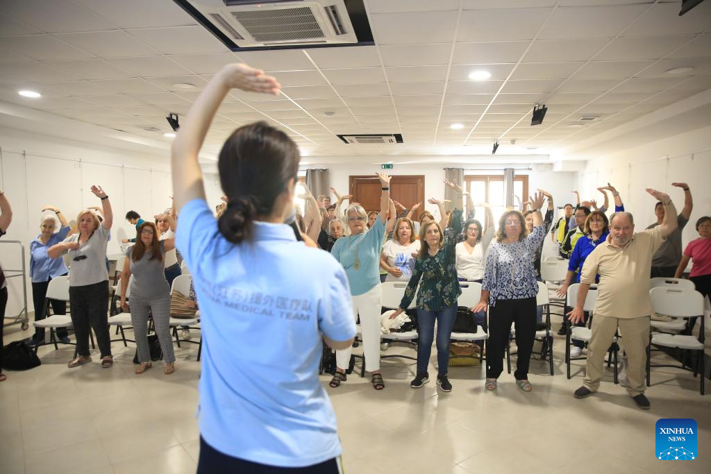 Tang Limei, a member of the 20th Chinese medical team for Malta, gives a lecture on Baduanjin, a traditional form of Chinese aerobic exercise known for its health benefits, in Swieqi, Malta, on May 6, 2025. The 20th Chinese medical team from the Mediterranean Regional Centre for Traditional Chinese Medicine (MRCTCM) provided free clinical services to residents at the Swieqi Local Council in eastern Malta on Tuesday. (Xinhua/Chen Wenxian)