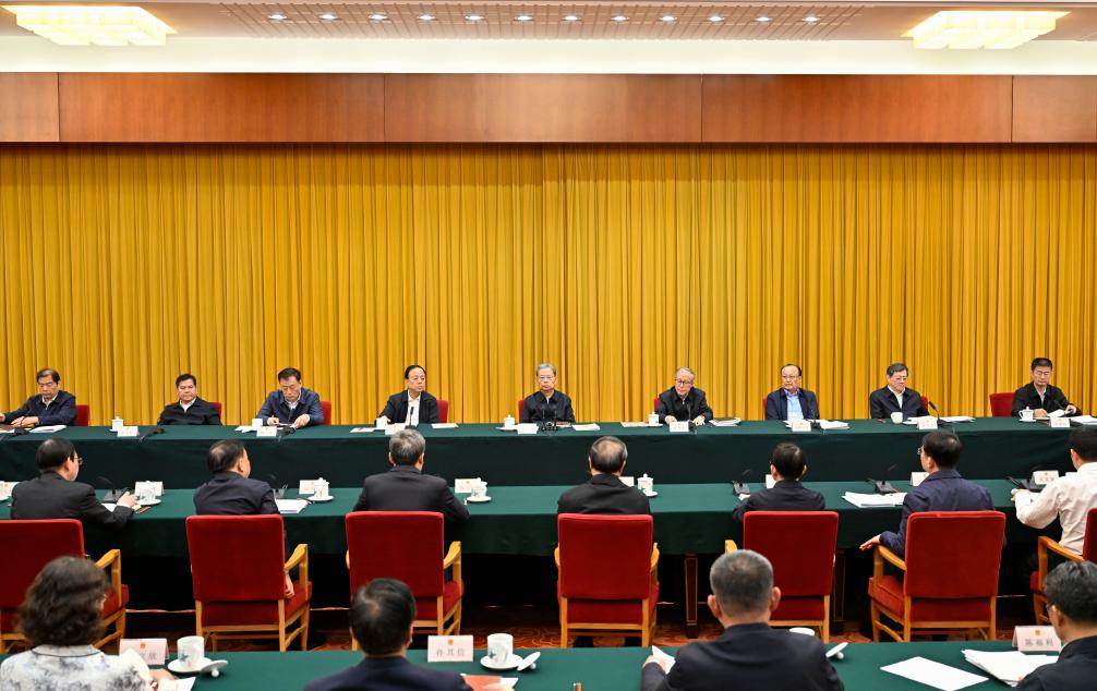 Zhao Leji, chairman of the National People's Congress Standing Committee and a member of the Standing Committee of the Political Bureau of the Communist Party of China Central Committee, speaks to members of a Forest Law enforcement inspection team at a meeting in Beijing, capital of China, May 6, 2025. (Xinhua/Yin Bogu)