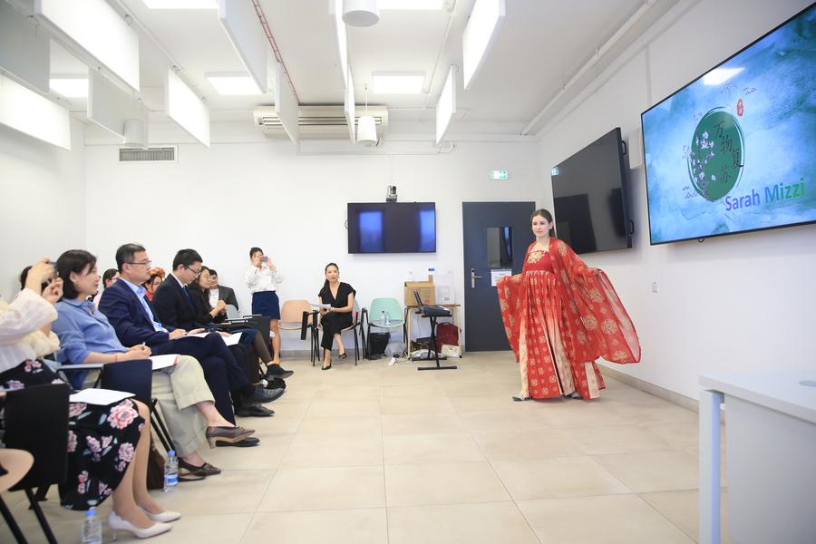 A student performs a Chinese costume show during the Maltese leg of the 24th "Chinese Bridge" Chinese proficiency competition for foreign university students at the University of Malta in Msida, Malta, on May 7, 2025. (Xinhua/Chen Wenxian)