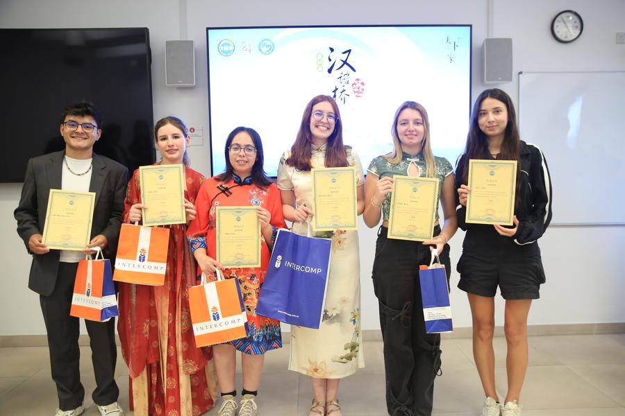 Students pose with award certificates of the Maltese leg of the 24th "Chinese Bridge" Chinese proficiency competition for foreign university students at the University of Malta in Msida, Malta, on May 7, 2025. Six students from the University of Malta showcased their Chinese language skills and talents on Wednesday during the Maltese leg of the 24th "Chinese Bridge" Chinese proficiency competition for foreign university students. (Xinhua/Chen Wenxian)
