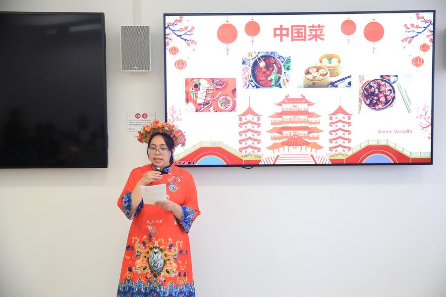 A student gives a speech during the Maltese leg of the 24th "Chinese Bridge" Chinese proficiency competition for foreign university students at the University of Malta in Msida, Malta, on May 7, 2025. (Xinhua/Chen Wenxian)