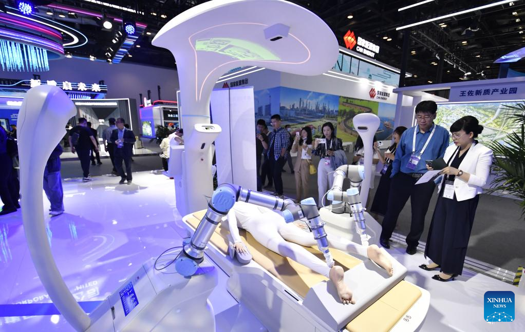 People watch a robot demonstrating traditional Chinese medicine therapy during the 27th China Beijing International High-tech Expo in Beijing, capital of China, May 8, 2025. The expo opened here on Thursday and will last until May 11. Boasting an exhibition area of about 50,000 square meters, the event has attracted more than 800 exhibitors from home and abroad. (Xinhua/Li Xin)