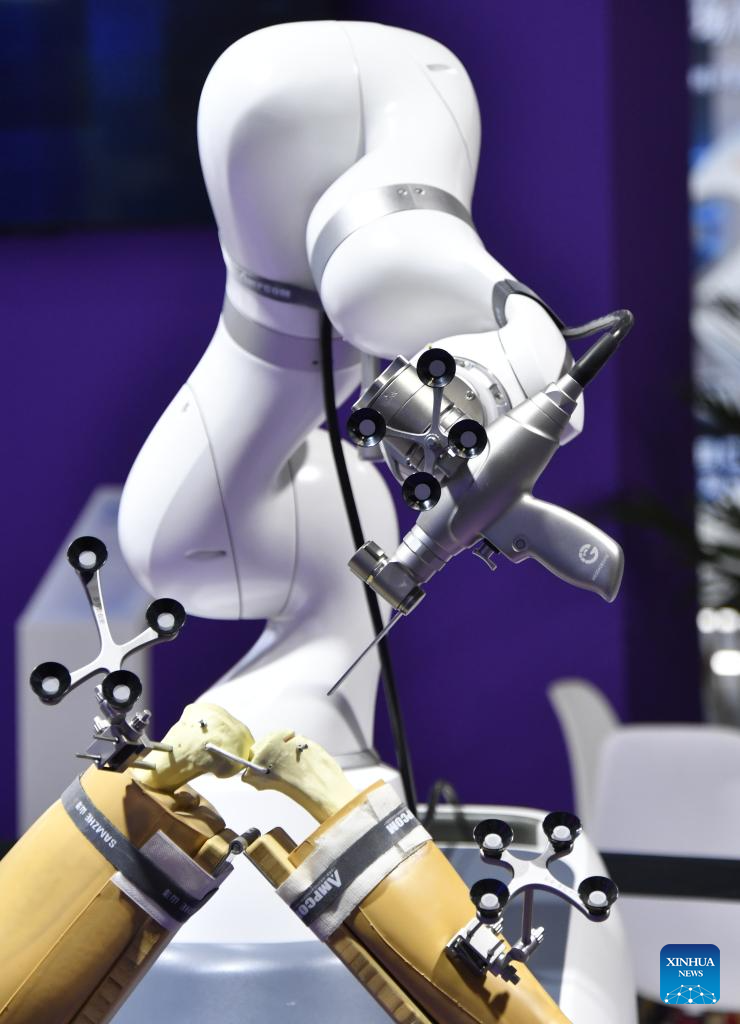 A smart robot for orthopedic surgery is seen during the 27th China Beijing International High-tech Expo in Beijing, capital of China, May 8, 2025. The expo opened here on Thursday and will last until May 11. Boasting an exhibition area of about 50,000 square meters, the event has attracted more than 800 exhibitors from home and abroad. (Xinhua/Li Xin)