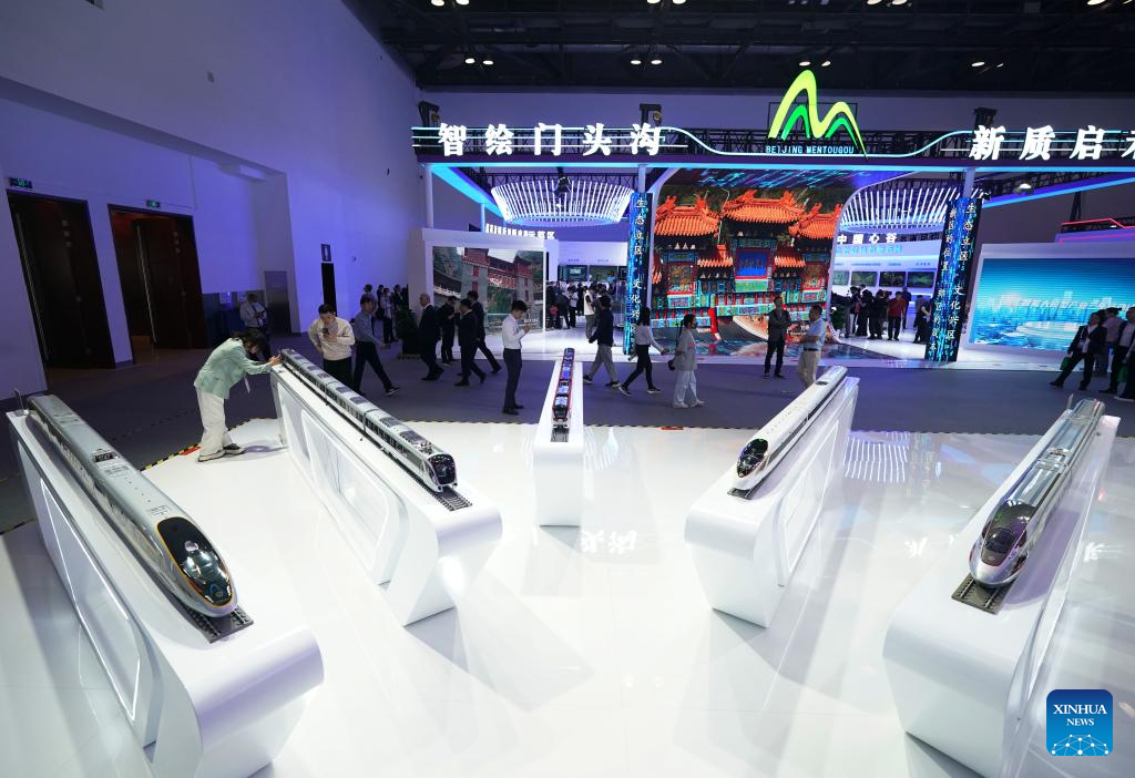 People watch high-speed railway train models during the 27th China Beijing International High-tech Expo in Beijing, capital of China, May 8, 2025. The expo opened here on Thursday and will last until May 11. Boasting an exhibition area of about 50,000 square meters, the event has attracted more than 800 exhibitors from home and abroad. (Xinhua/Zhang Chenlin)