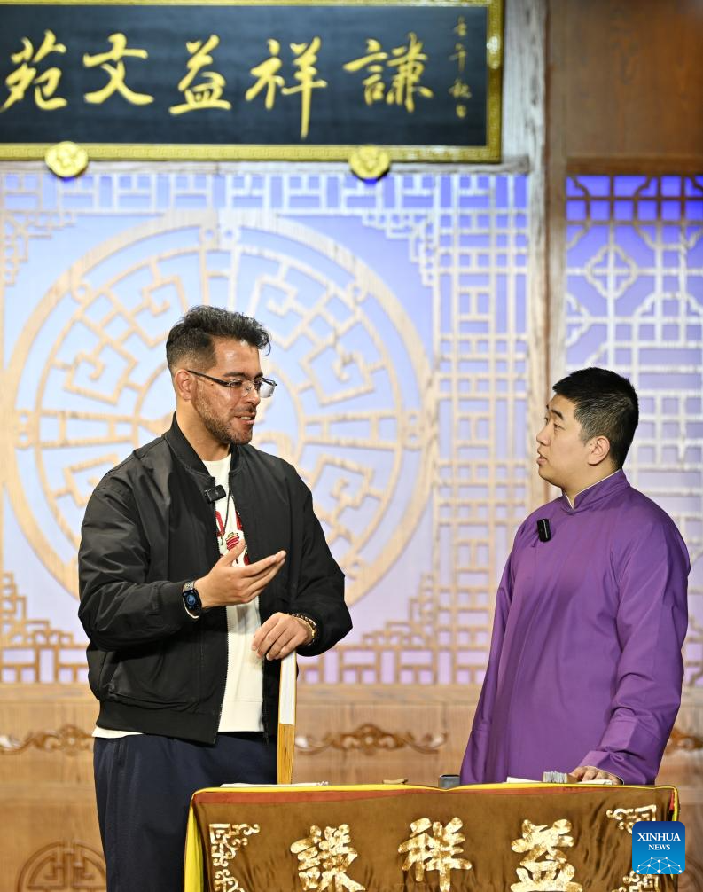 Raydis Franco (L) communicates with a professional cross-talk performer at a tea house in Hongqiao District of north China's Tianjin, April 24, 2025. (Xinhua/Li Ran)