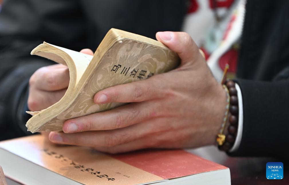 Raydis Franco browses selections of cross-talk works of Ma Sanli, a renowned cross-talk performer, in Dongli District of north China's Tianjin, April 24, 2025. (Xinhua/Li Ran)