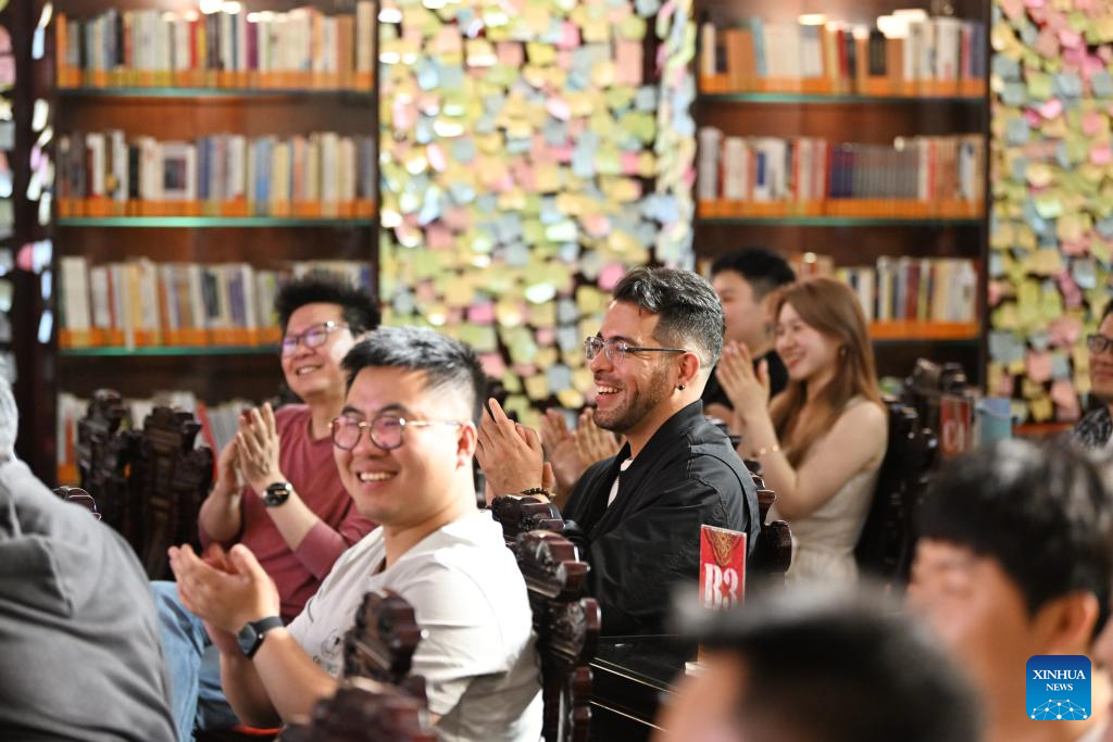 Raydis Franco (C) watches cross-talk performance at a tea house in Hongqiao District of north China's Tianjin, April 24, 2025. (Xinhua/Li Ran)