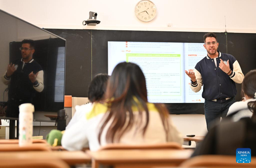 Raydis Franco gives a lecture at the School of Foreign Studies in Nankai University in north China's Tianjin, April 29, 2025. (Xinhua/Li Ran)