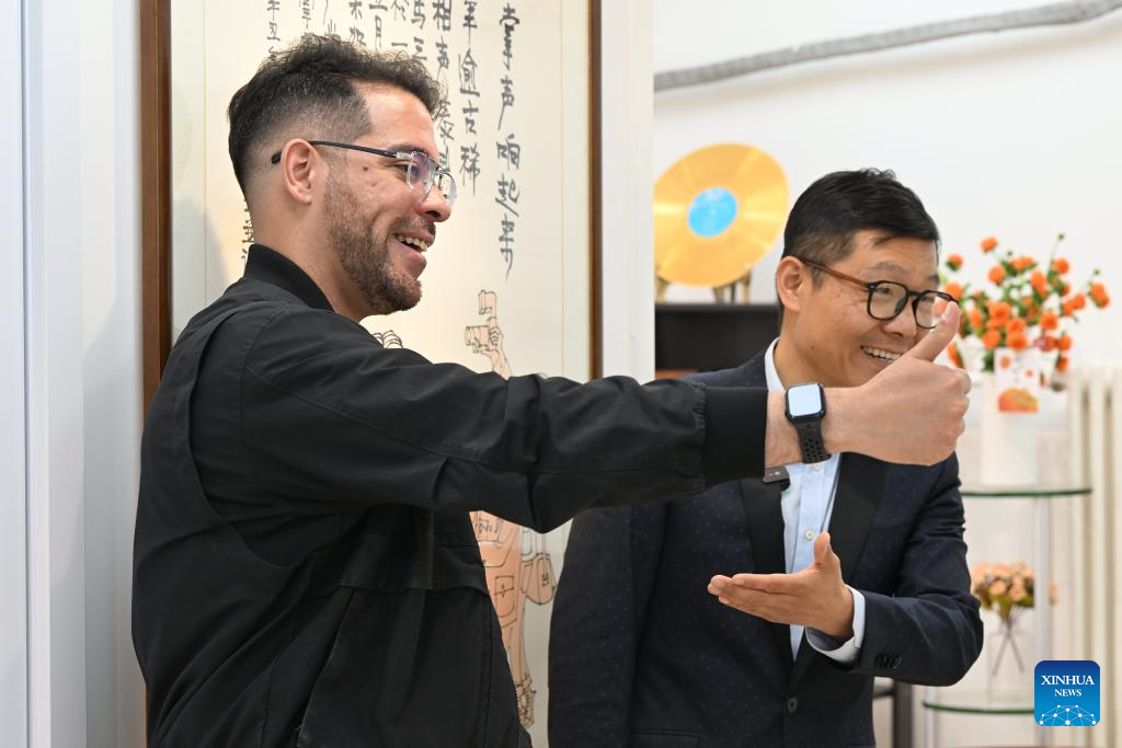 Raydis Franco (L) poses for photos with Ma Xiaochuan, the grandson of Ma Sanli, a renowned cross-talk performer, in Dongli District of north China's Tianjin, April 24, 2025. (Xinhua/Li Ran)