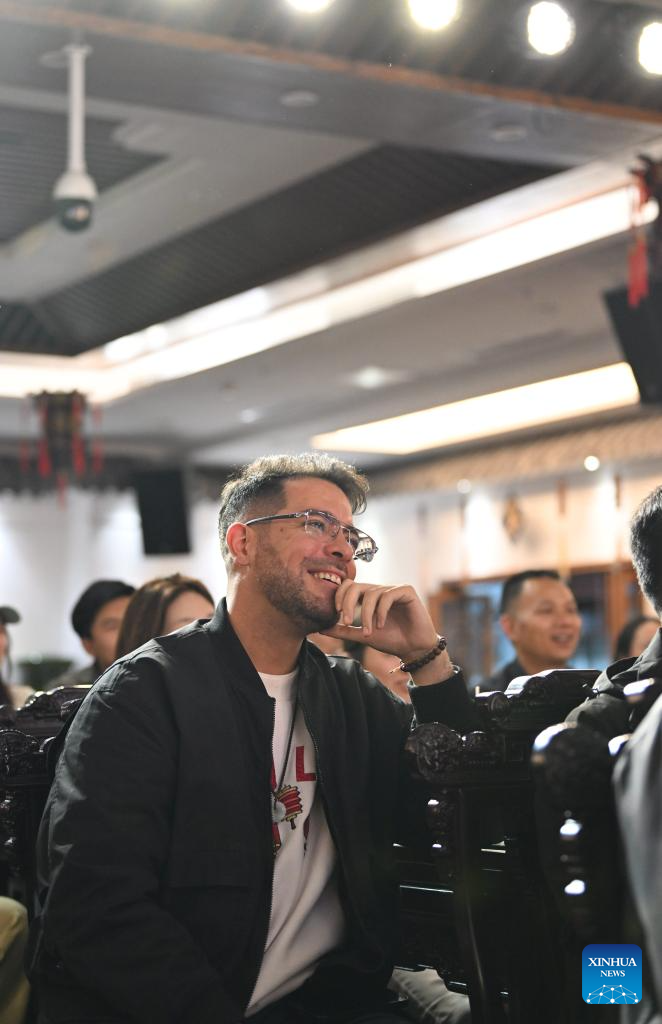 Raydis Franco watches cross-talk performance at a tea house in Hongqiao District of north China's Tianjin, April 24, 2025. (Xinhua/Li Ran)