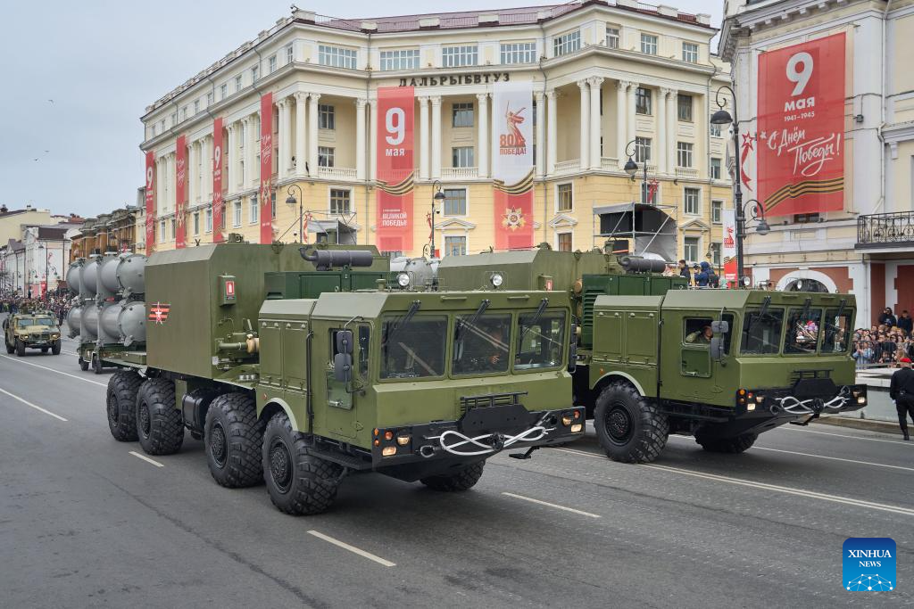 Armored vehicles are pictured during a military parade to commemorate the 80th anniversary of the Victory in the Great Patriotic War in Vladivostok, Russia, May 9, 2025. (Photo by Guo Feizhou/Xinhua)