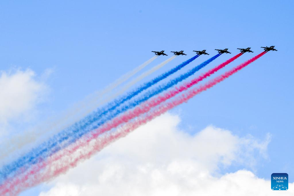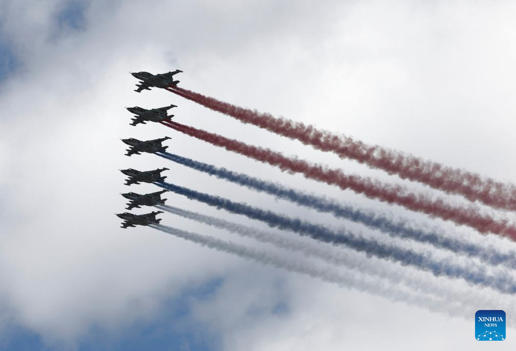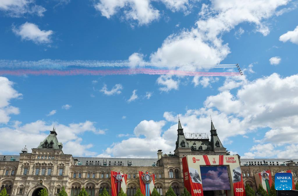 Aircraft fly in formation during a grand parade marking the 80th anniversary of the victory in the Soviet Union's Great Patriotic War in Moscow, Russia, May 9, 2025. (Xinhua/Lai Xiangdong)