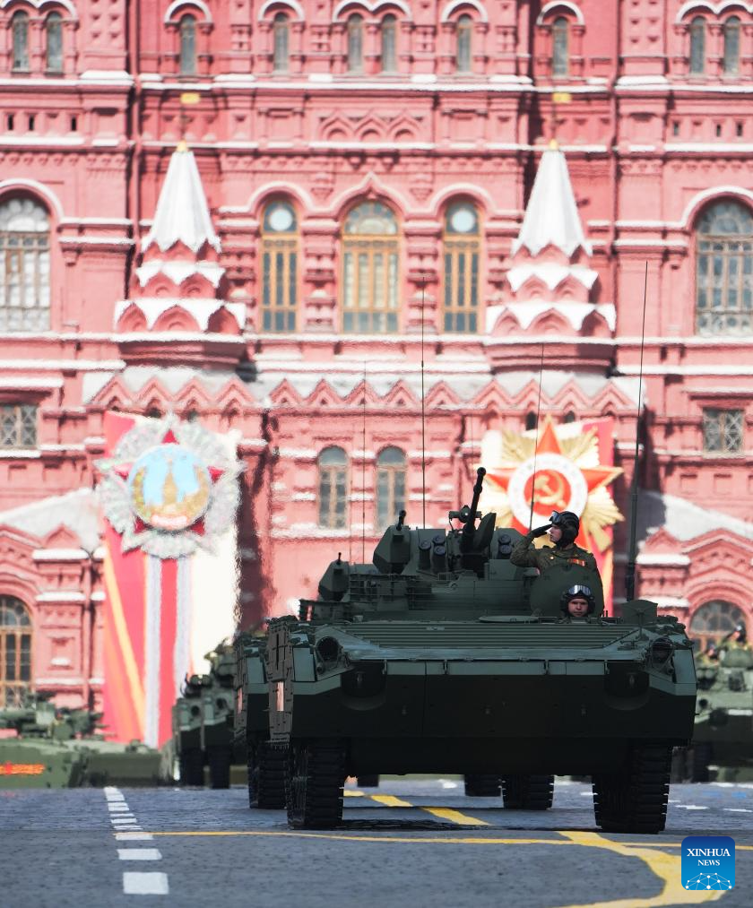 Infantry fighting vehicles march during a grand parade marking the 80th anniversary of the victory in the Soviet Union's Great Patriotic War in Moscow, Russia, May 9, 2025. (Xinhua/Lai Xiangdong)