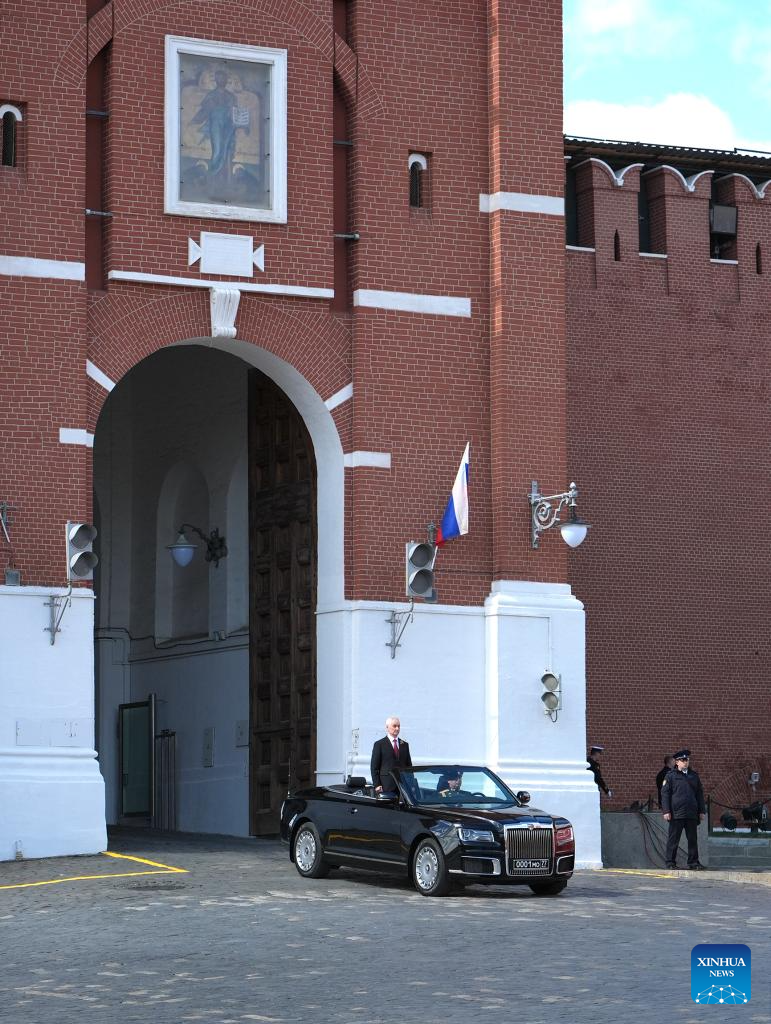 Russian Defense Minister Andrei Belousov prepares to review the troops during a grand parade marking the 80th anniversary of the victory in the Soviet Union's Great Patriotic War in Moscow, Russia, May 9, 2025. (Xinhua/Lai Xiangdong)